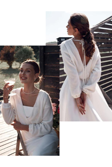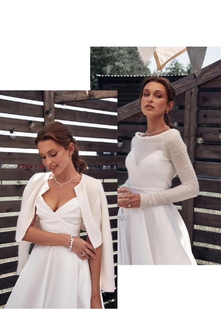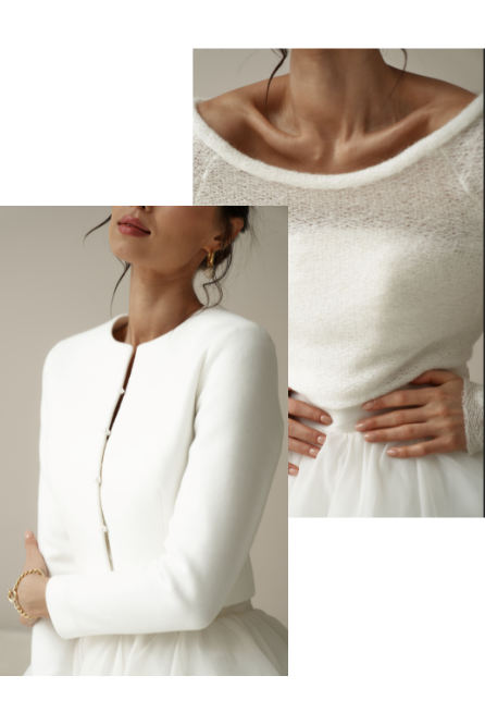 We are a family-run atelier with over 15 years of experience, specializing in creating exquisite outerwear for brides. Our collection features stylish jackets, coats, and cardigans made from high-quality wool and cashmere, adding elegance and comfort to your look. We take pride in using unique fabrics and are ready to bring your ideas to life, making your wedding day unforgettable.