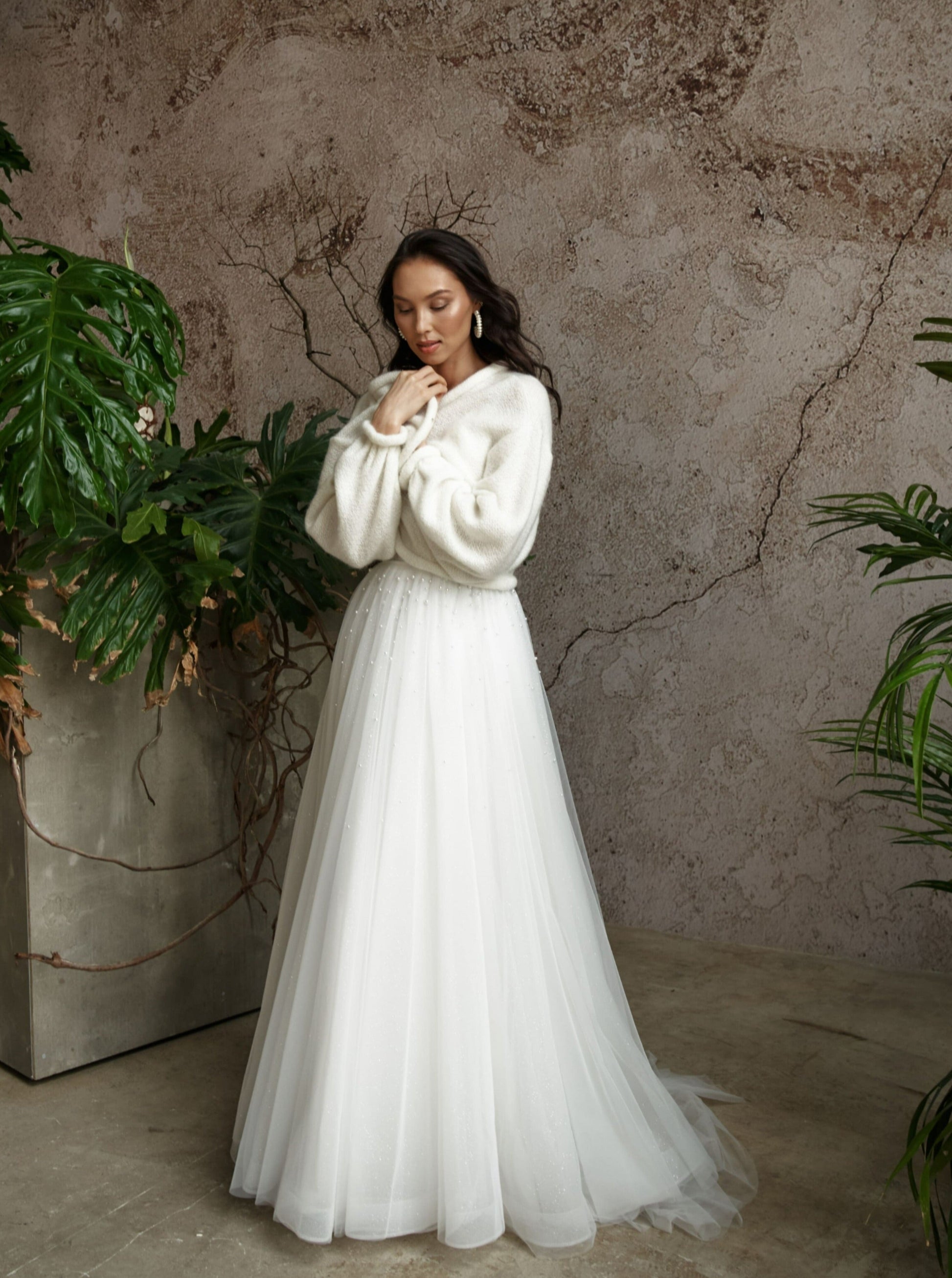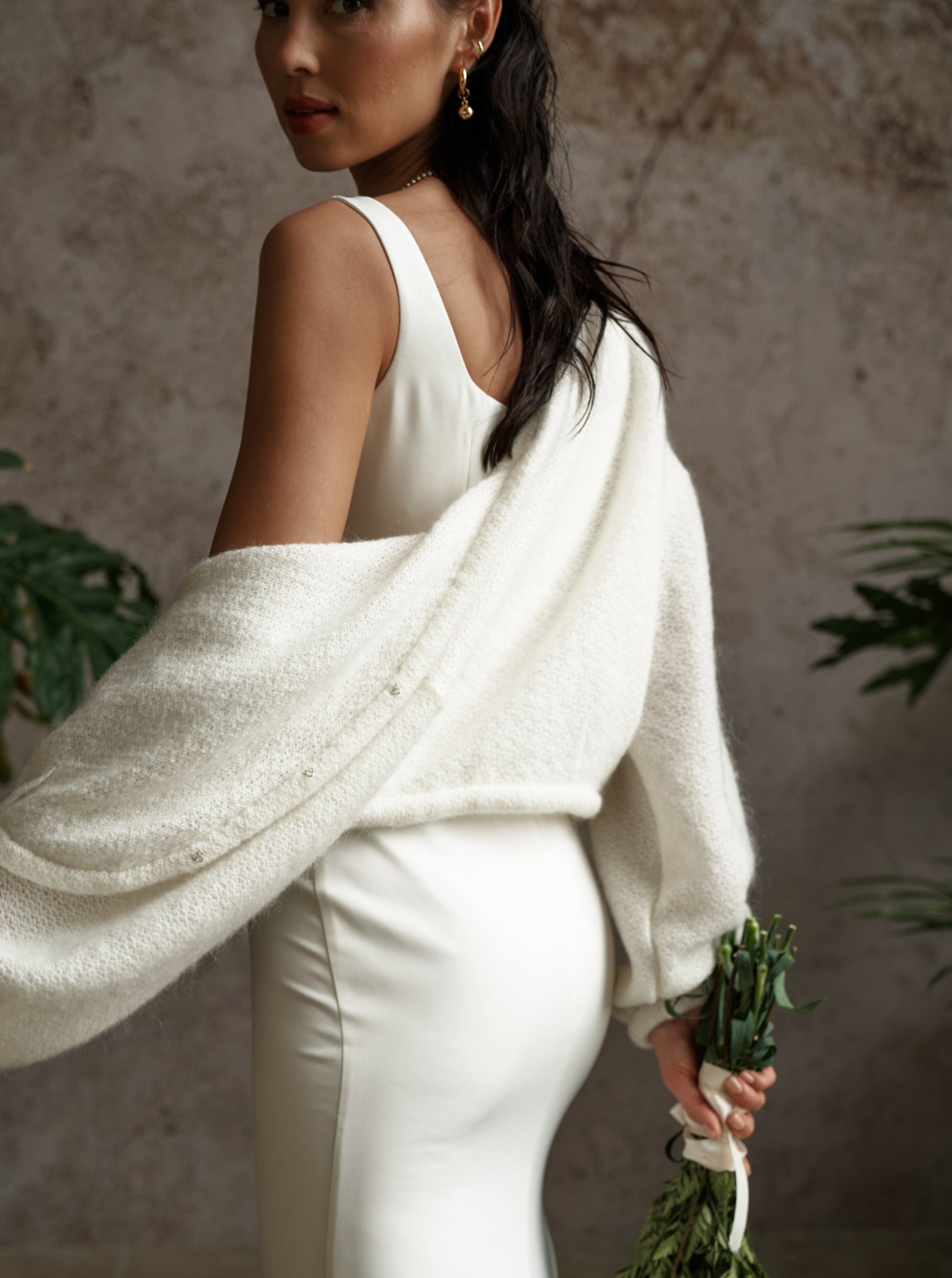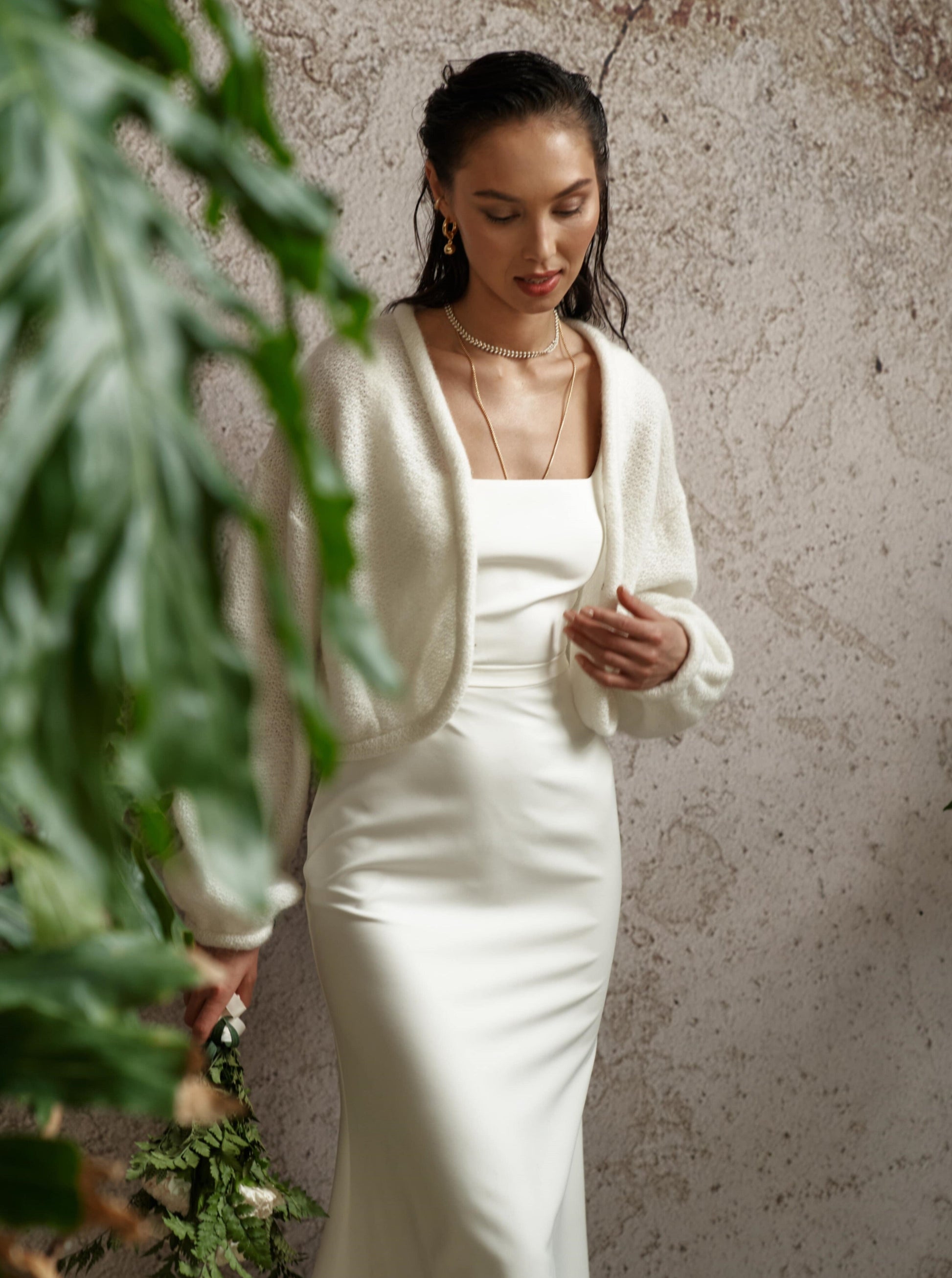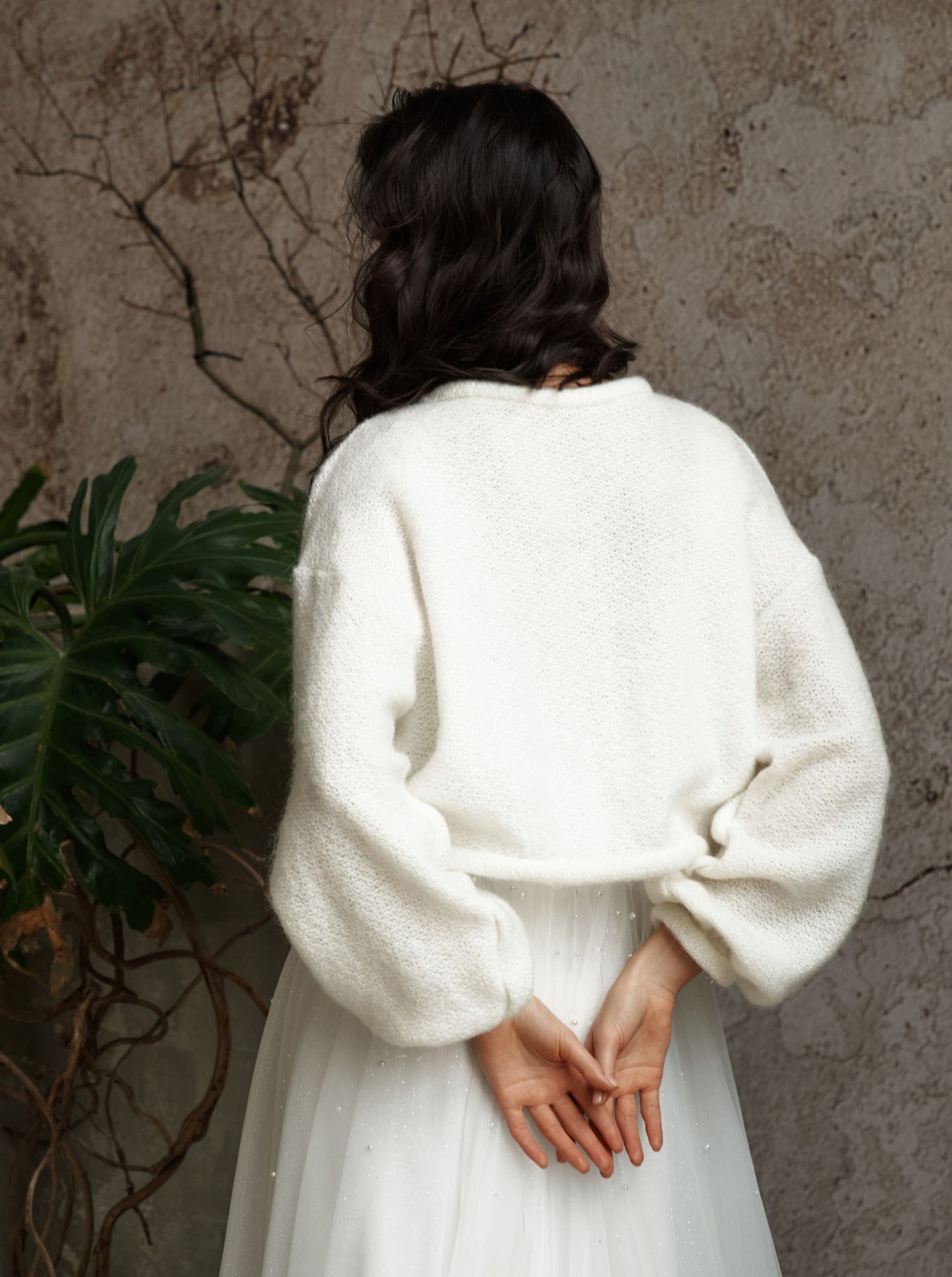 This Fluffy Bridal cardigan is a special cover up designed to be a part of your wedding outfit. This wedding jacket is made of soft lightweight mohair wool to be a perfect addition to your wedding dress. This wool cardigan has a free fit and voluminous balloon sleeves, it closes on 3 hooks and looks good with both dresses closed and open in the front. Special double-faced knitting makes this bridal bolero extremely lightweight but very warm. It will be a perfect addition to your wedding evening party, Cityhall registration or stylish wedding photoshoot.