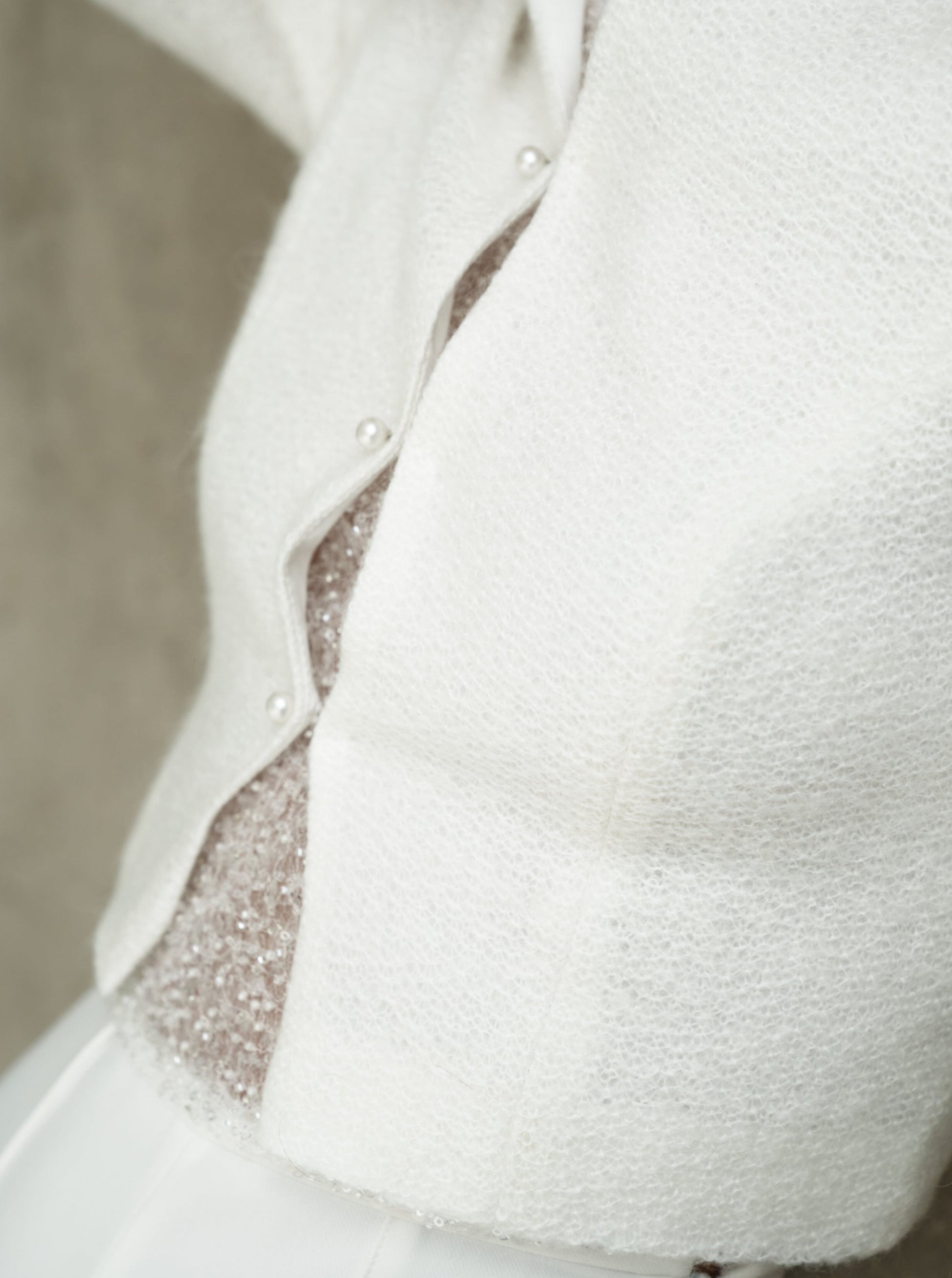 Stylish and soft jacket with delicate texture similar to knitted lace with decorative pearl buttons and hook fasteners in front will become a fashionable and functional accessory for each bride. This modern and stylish jacket is made of natural, very soft and delicate mohair wool with silky viscose lining. It is extremely soft, cozy and warm which makes it an ideal addition for winter or autumn weddings. Our cozy bridal jacket combines the durable properties of wool while also ensuring an exquisitely soft touch making it a lovely option even for the most sensitive brides.