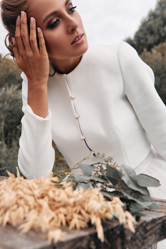 Cuenta con ribetes detallados y costuras finas en un ajuste perfecto. La chaqueta de novia es 100% única y está hecha a mano con lana natural y un 30% de cashmere. El forro de viscosa aporta comodidad y calidez a la chaqueta de invierno color marfil.