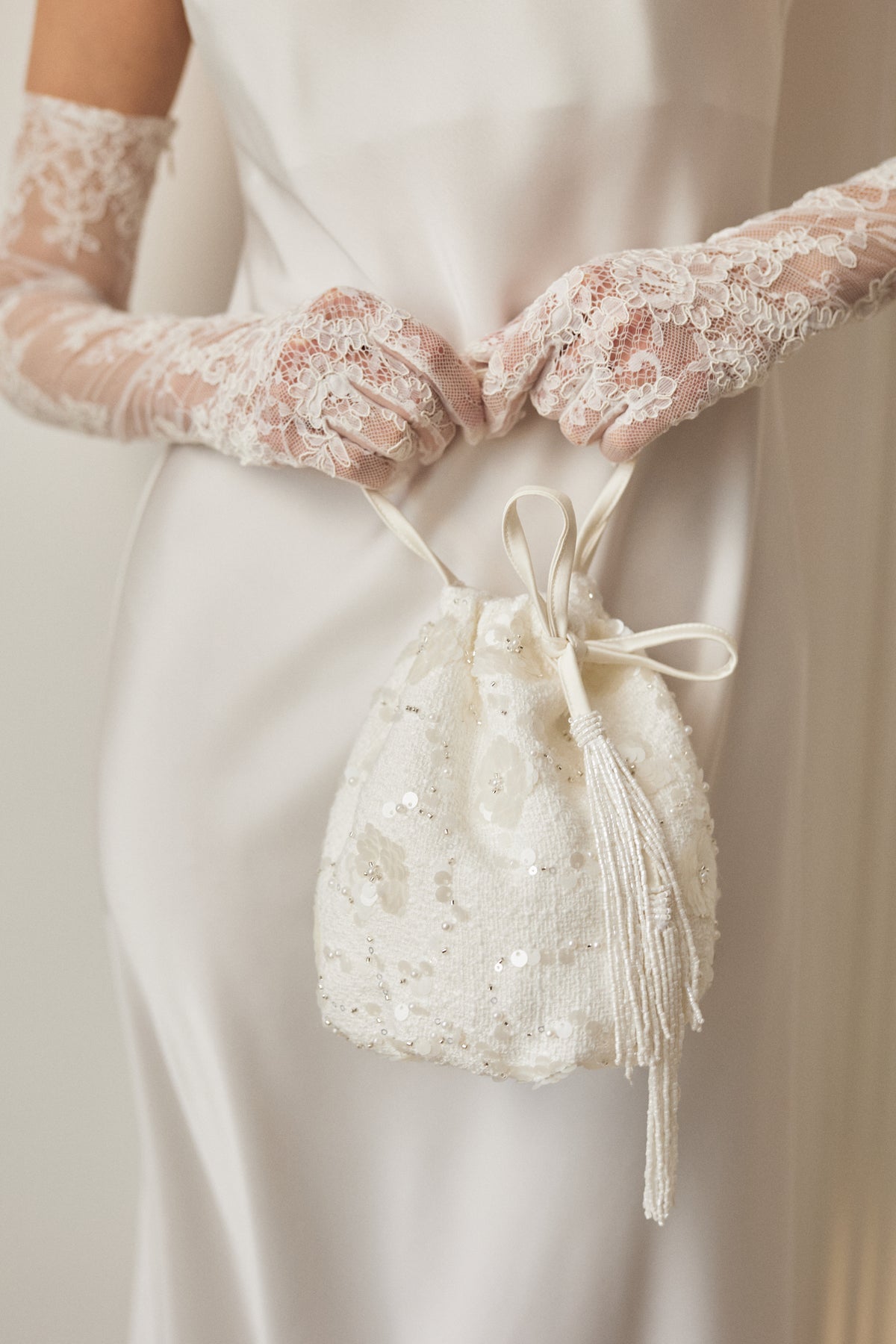 A romantic twist on the classic clutch — this bridal bucket bag is a true showstopper. Hand-embellished with delicate flowers, sequins, and pearls, it’s the perfect accessory to carry your essentials in style on the big day.