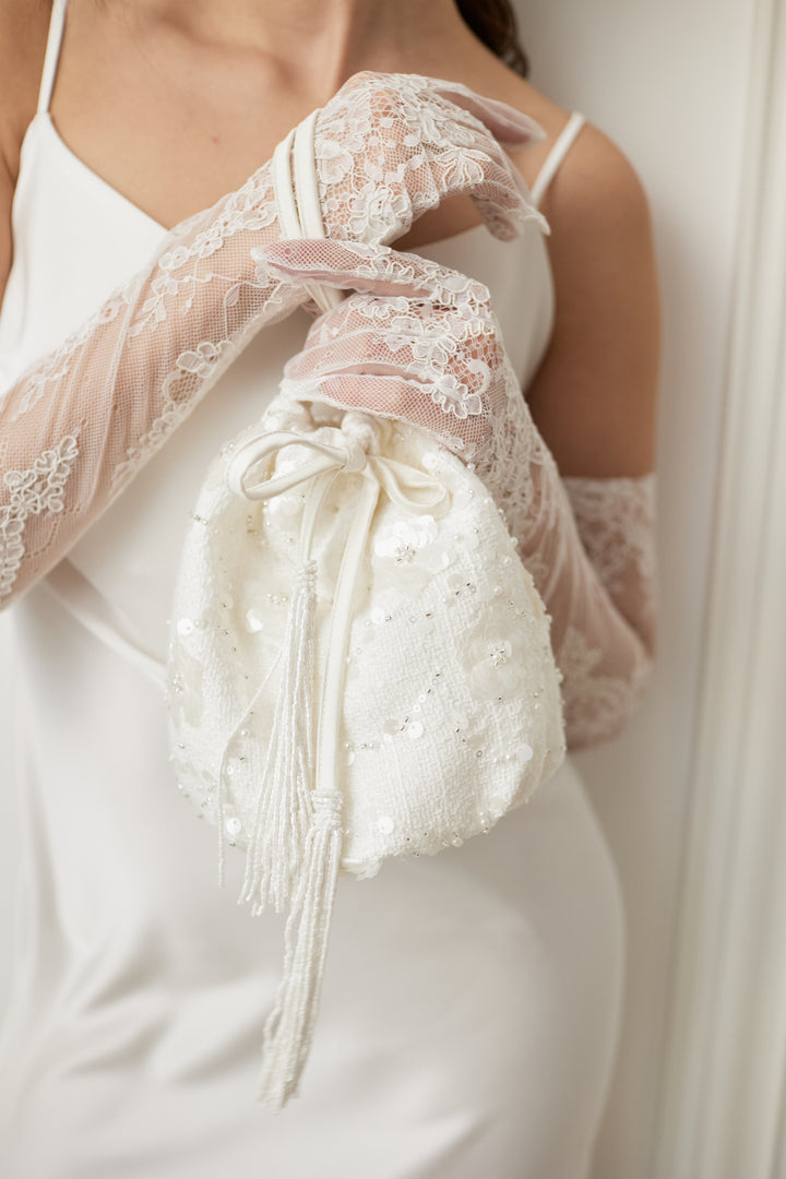 Designed to be worn on the wrist, this wedding wrist bag clutch combines elegance with ease. The soft structure and satin drawstring closure keep it looking graceful, while the floral details add a dreamy, feminine touch. Whether you're a bride, bridesmaid, or wedding guest, this bridal clutch will elevate your entire look.