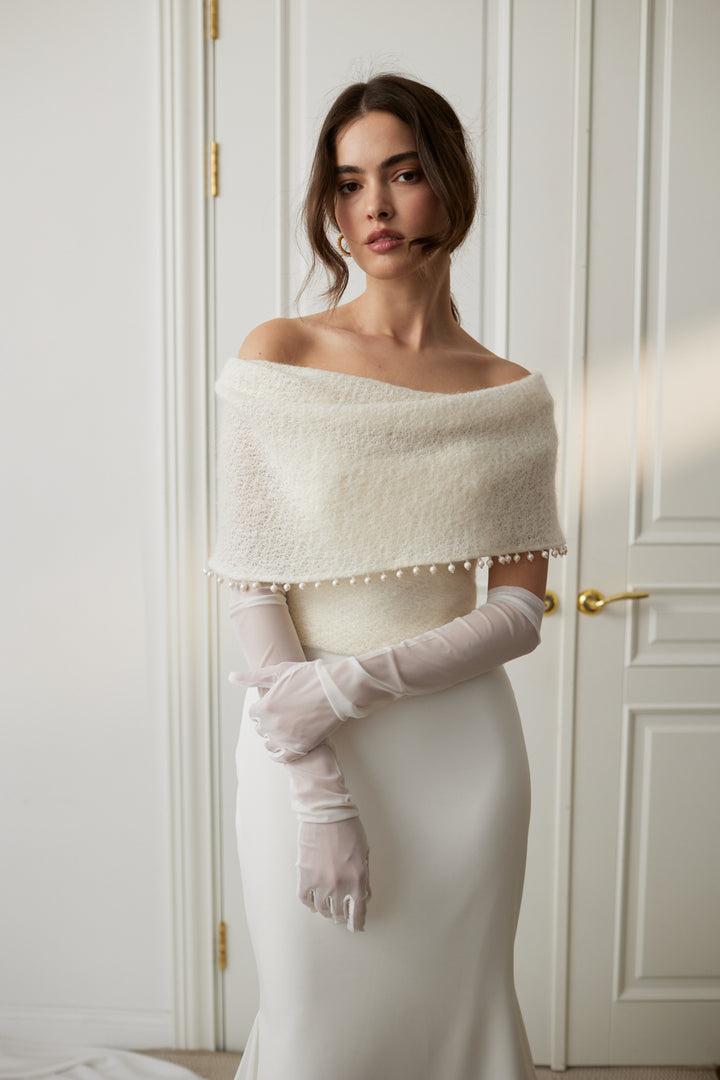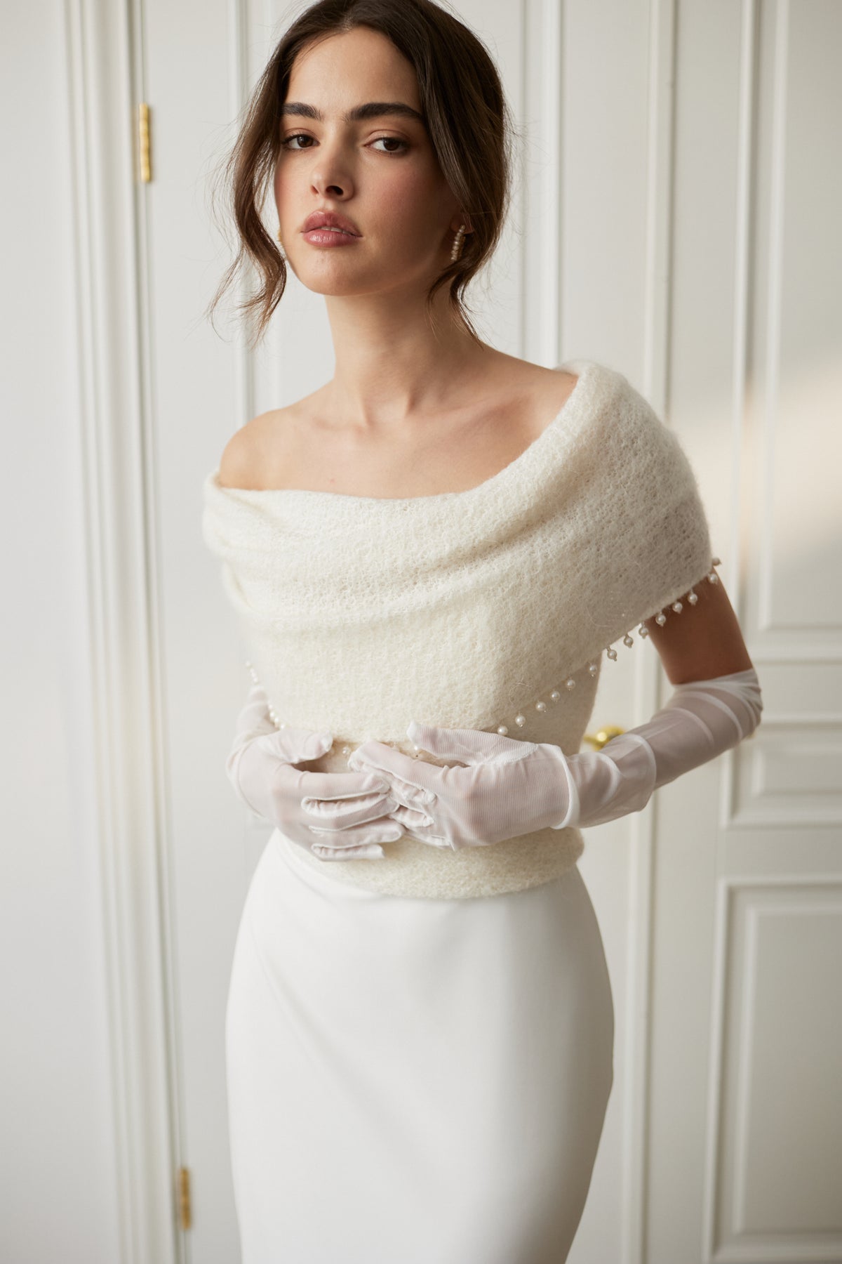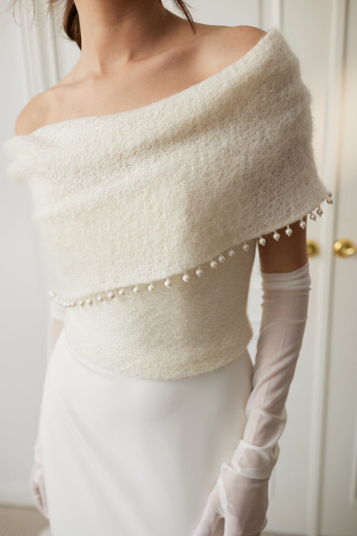Romantic, soft, and effortlessly elegant — this off-the-shoulder wedding shrug is the ultimate cozy-chic layer for your special day. Made from a soft mohair-blend knit in a warm off white shade, it gently drapes over your arms and shoulders without overpowering your dress.